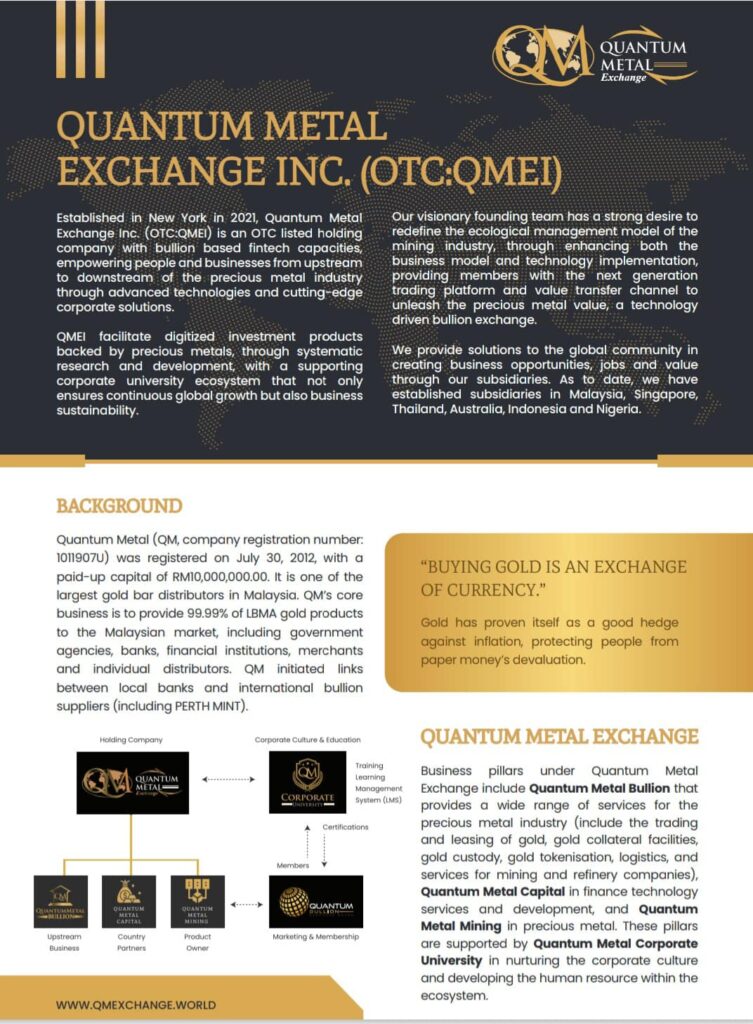 Established in New York 2021, Quantum Metal Exchange Inc (OTC: QMEI) is an OTC listed holding company with bullion based fintech capacities , empowering people and businesses from upstream to downstream of the precious metal industry through advanced technologies and cutting edge corporate solutions.