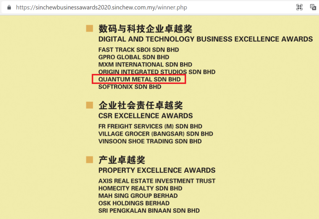 Quantum Metal is the recipient of Digital and Technology Business Excellence Award in Sin Chew Business Excellence Awards 2020 – Innovation . Transformation . Sustainability . Leadership.